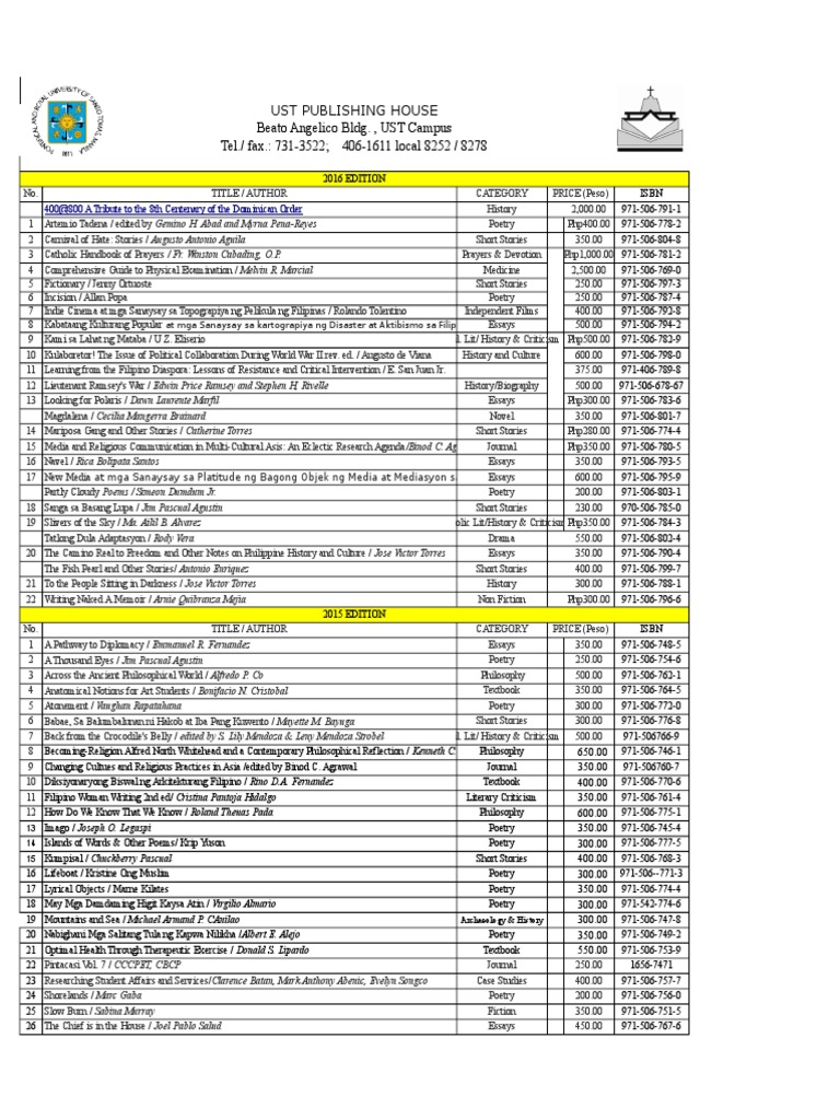 Ust Publishing House Publishing history this is a chart to show the when this publisher published books. It traces its origins to the ust press, which was founded in 1593 as the philippine press, antedating the. * * * the ust publishing house is the publishing arm of the university of santo tomas. Manila, philippines—the ust publishing house (ustph), the publishing arm of the university of santo tomas, is set to hold a collective launching of its 17 titles published within the past year on.